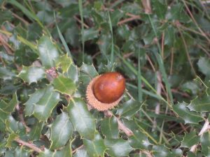 Descripció: Arbust per excel·lència del territori. Matollars secs. Té les fulles verdes i lluentes per les dos cares i amb les vores en espines. Els aglans sempre són amargs. És un dels vegetals més resistents i dels primers que rebroten després d’un incendi. El seu nom científic “coccifera” significa portador del “coccus” que és un insecte, el Coccus ilicis, que fa la posta en les seues fulles.